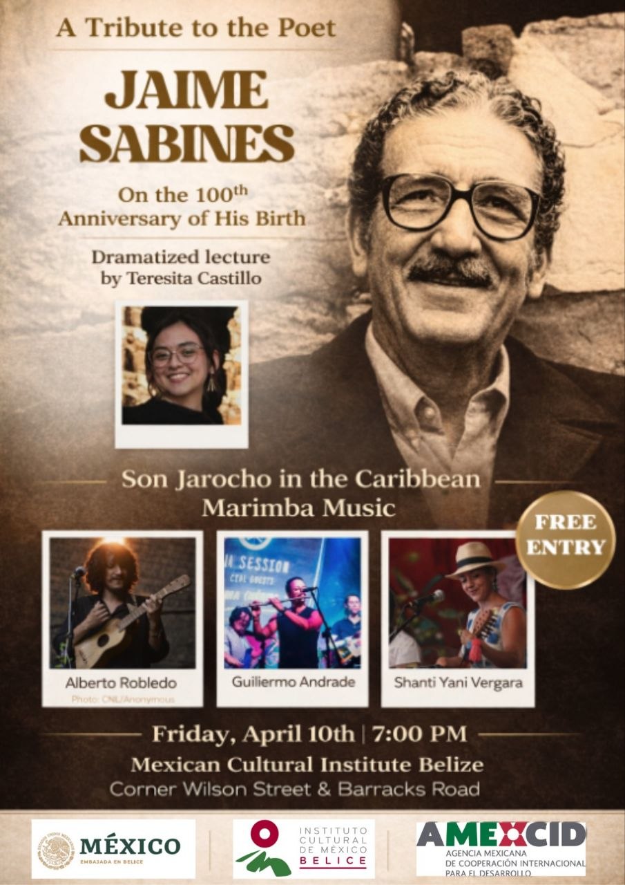 La conmemoración Homenaje a Jaime Sabines a 100 años de su natalicio, será el viernes 10 de abril a las 7 pm en el Instituto Cultural de México, Corner Wilson Street & Barracks Road, Belize City, Belize.