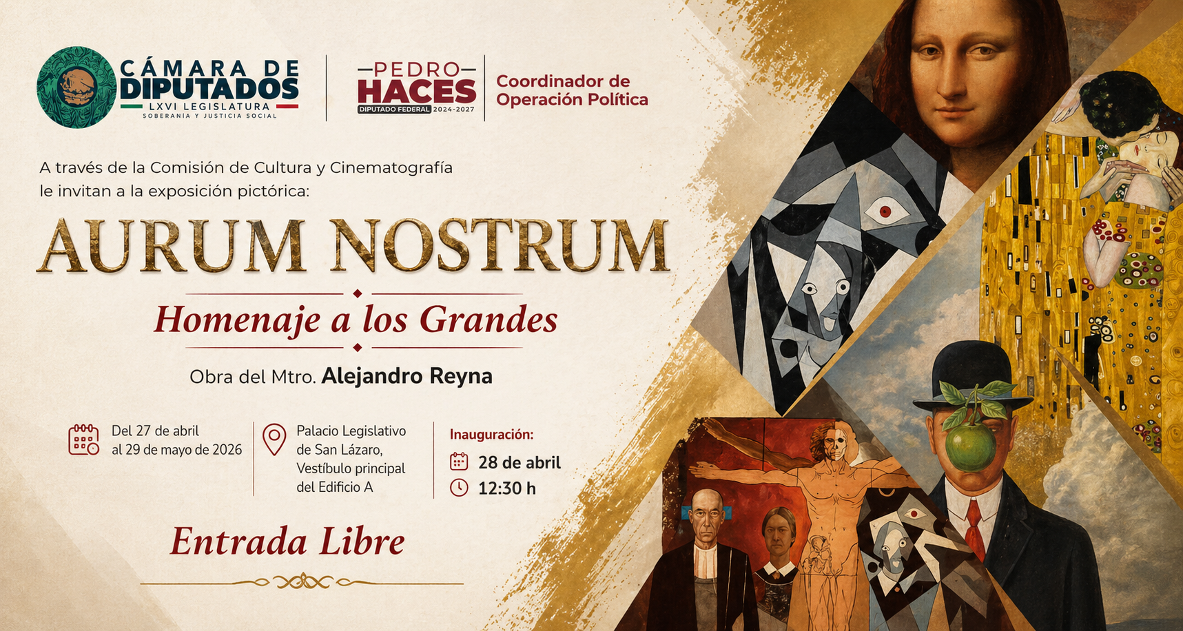 El diputado federal Pedro Haces Barba, coordinador de Operación Política encabezará la inauguración de la exposición pictórica “Aurum Nostrum: Homenaje a los Grandes”, obra del maestro Alejandro Reyna.